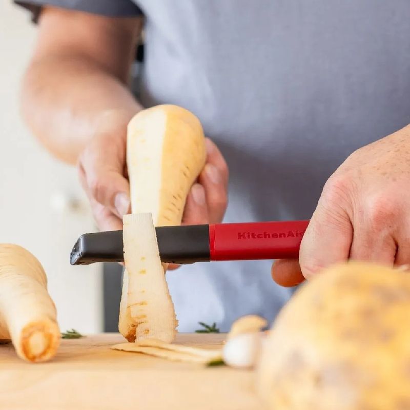 O Descascador Peeler KitchenAid é a escolha ideal para quem busca eficiência, conforto e qualidade no preparo de alimentos. Sua lâmina giratória em aço inoxidável proporciona cortes precisos e uniformes, facilitando o descasque de frutas, legumes e até o preparo de raspas de queijo ou chocolate. O design moderno aliado ao acabamento refinado garante praticidade e durabilidade no uso diário.
