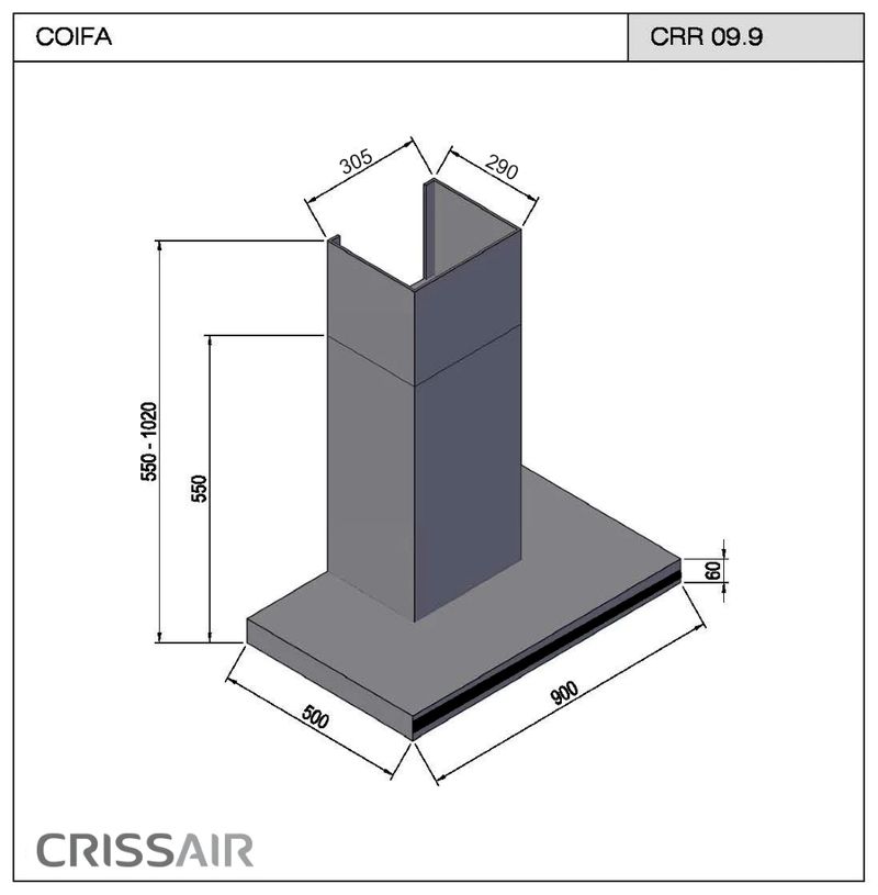 A coifa CRR 09.9 é produzida em aço inox com acabamento em cristal preto, este modelo possui comando touch com três velocidades mais timer, alcançando uma vazão de 1.050m³/h.