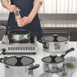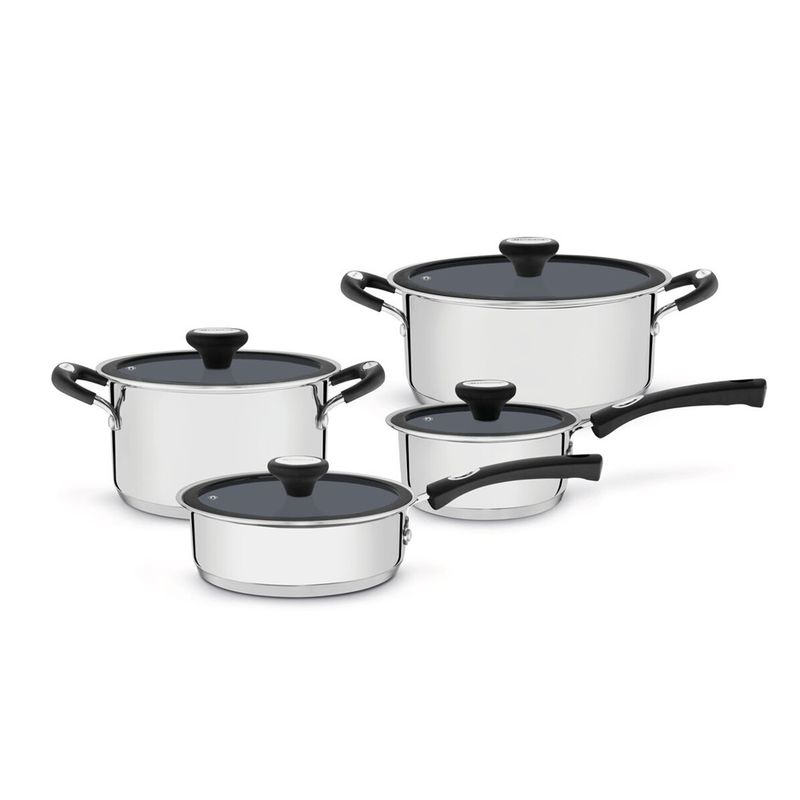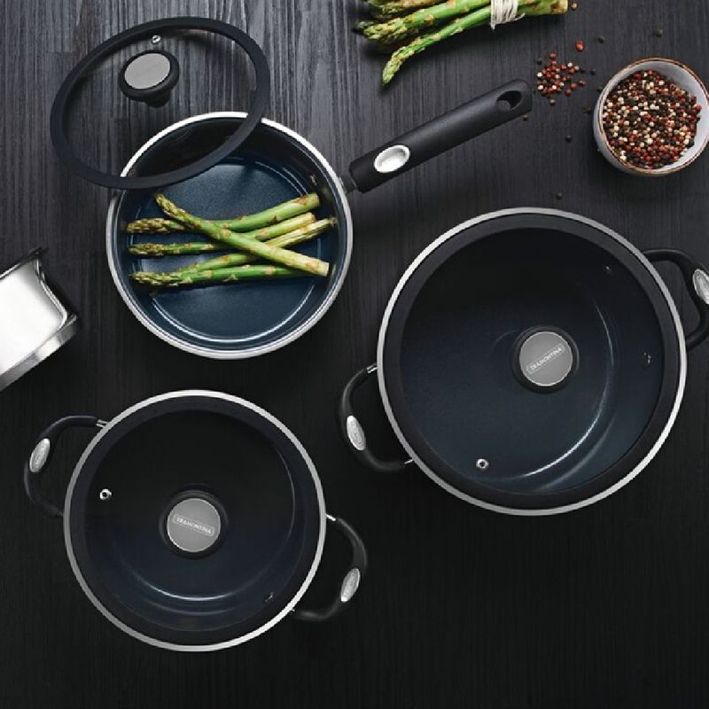 O fundo triplo distribui o calor de forma homogênea, otimizando o tempo de cocção e proporcionando economia de energia. As tampas de vidro temperado com saída de vapor permitem acompanhar o preparo dos alimentos com segurança, enquanto os cabos e alças com revestimento em silicone oferecem conforto térmico e firmeza no manuseio. Compatível com todos os tipos de fogão, inclusive indução, o conjunto alia praticidade, resistência e um design elegante para o dia a dia.