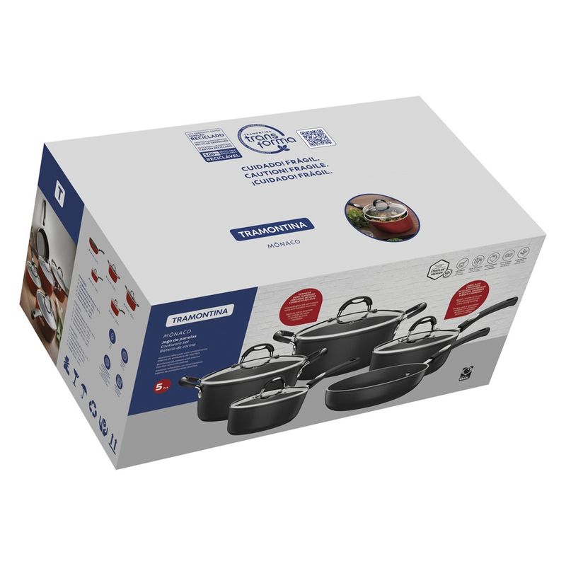 Quem busca qualidade e funcionalidade para sua cozinha, precisa contar com o jogo de panelas Tramontina Mônaco em alumínio com revestimento interno e externo em Starflon Premium preto 05 peças. Essenciais para um dia a dia na cozinha muito mais prático, as peças do jogo são produzidas em alumínio e contam com revestimento em antiaderente Starflon Premium. Devido as essas características, as peças cozinham os alimentos de maneira rápida e uniforme, evitam que eles grudem na superfície e são superfáceis de limpar. As panelas e as caçarolas vem com tampa de vidro temperado com bordas de aço inox e saídas de vapor que auxilia no preparo das receitas e facilita a visualização. Os cabos, alças e pegadores são metálicos com proteção em silicone e não aquecem, garantindo assim, um manuseio muito mais seguro. Além de todas essas características, as peças ainda podem ir à máquina de lavar louças, otimizando suas tarefas na cozinha!