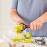 Sua lâmina giratória em aço inoxidável garante eficiência, resistência à ferrugem e durabilidade. Já o cabo ergonômico em ABS com acabamento fosco proporciona conforto, firmeza e higiene mesmo em usos prolongados. Para maior praticidade, conta com alça integrada para pendurar e capa protetora de segurança.