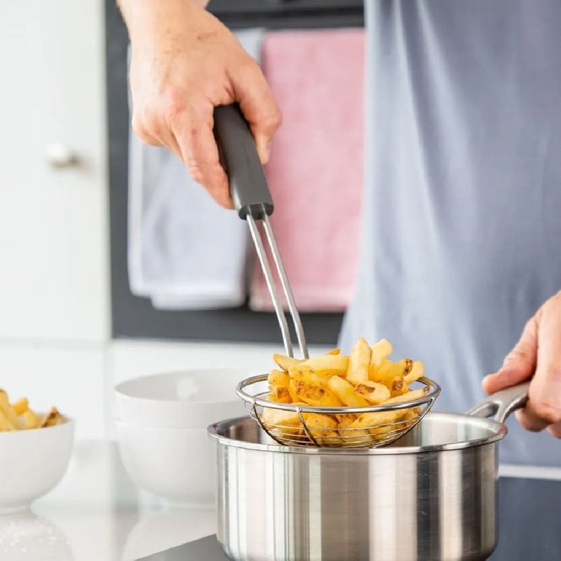 A escumadeira KitchenAid para fritura é um utensílio essencial para quem busca eficiência, segurança e elegância no preparo de alimentos fritos. Com design moderno e funcional, permite retirar os alimentos do óleo com facilidade, garantindo a drenagem rápida de líquidos e gorduras durante o uso.