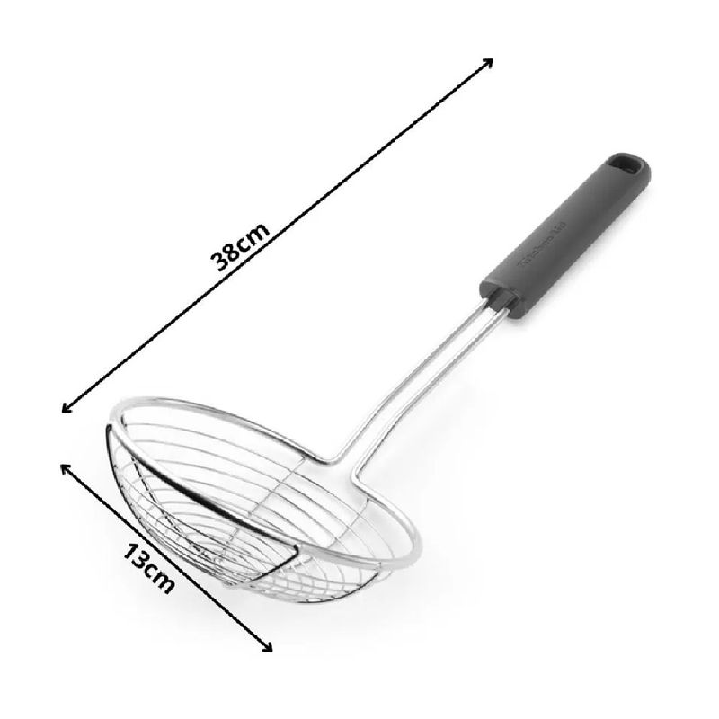 Produzida com parte principal em aço inox extra grande e perfurada, conta com uma cesta de malha que favorece o escoamento eficiente. O cabo longo em ABS com acabamento fosco oferece pegada firme, confortável e higiênica, mesmo em usos prolongados. A alça integrada para pendurar agrega praticidade e mantém a cozinha organizada no padrão KitchenAid.
