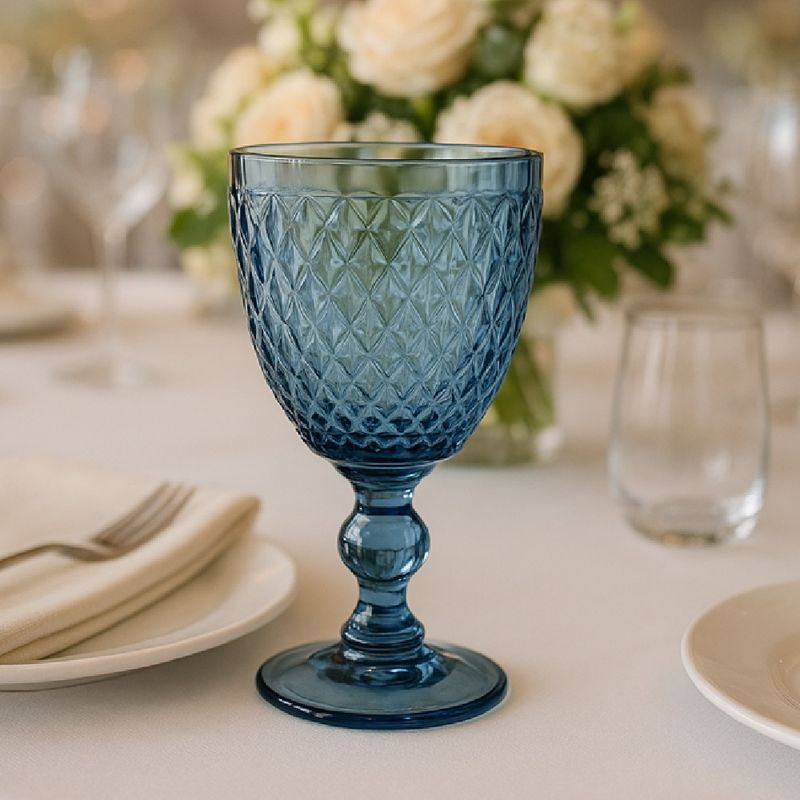 A Taça de Vinho com Textura Diamantada é uma peça sofisticada que combina o estilo retrô com um toque moderno. Seu relevo geométrico cria lindos reflexos de luz, valorizando a apresentação das bebidas e trazendo estilo à mesa em qualquer ocasião.