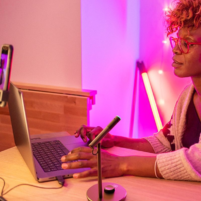 o jbl quantum stream talk foi desenvolvido para quem precisa de captação de voz clara, direta e com mínimo ruído ambiente. com padrão supercardioide, ele foca exclusivamente na voz do usuário, reduzindo sons indesejados ao redor — ideal para streamers, podcasters e criadores que trabalham em ambientes movimentados. o amortecedor integrado ao suporte ajuda a evitar vibrações e ruídos de toque na mesa. o microfone também permite monitoramento em tempo real por meio da saída p2 (3,5 mm), enquanto o botão multifuncional controla ganho, volume e mute imediato. com o software jbl quantumengine, é possível ajustar equalização, aplicar redução de ruído e realizar testes rápidos diretamente no pc, garantindo ainda mais controle sobre o áudio.